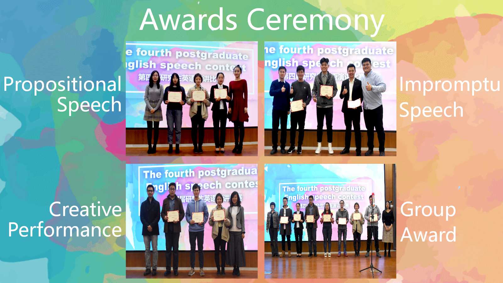 本次比賽共設(shè)“自命題演講”、“即興演講”和“創(chuàng)意表演”三個(gè)環(huán)節(jié),“自命題演講”的主題為“改革開放40周年”。根據(jù)比賽環(huán)節(jié)的設(shè)置,每位參賽選手不僅需要熟記文稿,還需要在現(xiàn)場(chǎng)靈活發(fā)揮。大家在舞臺(tái)上充分展現(xiàn)了自己的英語風(fēng)采,給評(píng)委和觀眾留下了深刻的印象。